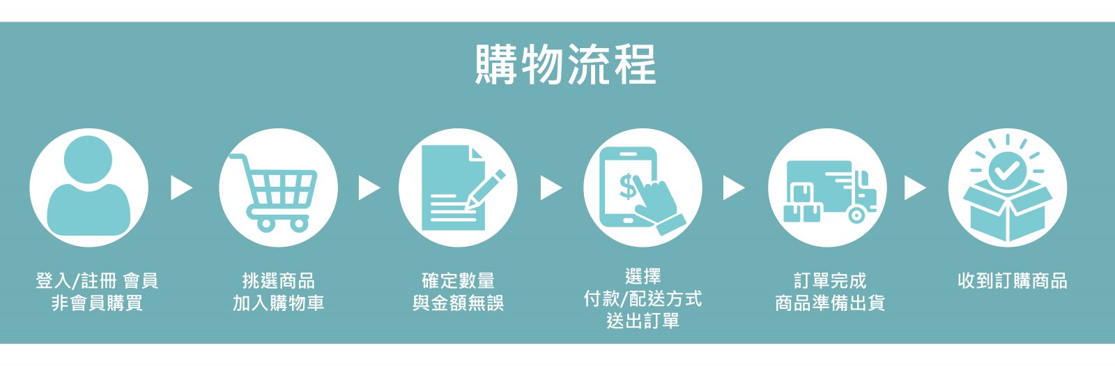 登入/註冊會員或非會員購買 > 選購商品 > 加入購物車結帳 > 確定數量與金額無誤  > 填寫付款方式 > 送出訂單 > 訂購完成
